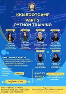 Pada Hari Minggu, 28 Mei 2023 beberapa Mahasiswa Matematika Universitas Diponegoro telah menyelenggarakan rangkaian acara berupa pelatihan Python dengan tema “Membangun Keterampilan Credit Scoring di
