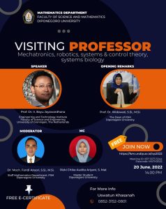 Department of Mathematics Faculty of Sciences and Mathematics Diponegoro University presents: VISITING PROFESSOR Mechatronics, Robotics, System, & Control Theory Will be held on: 🗓️ Monday,