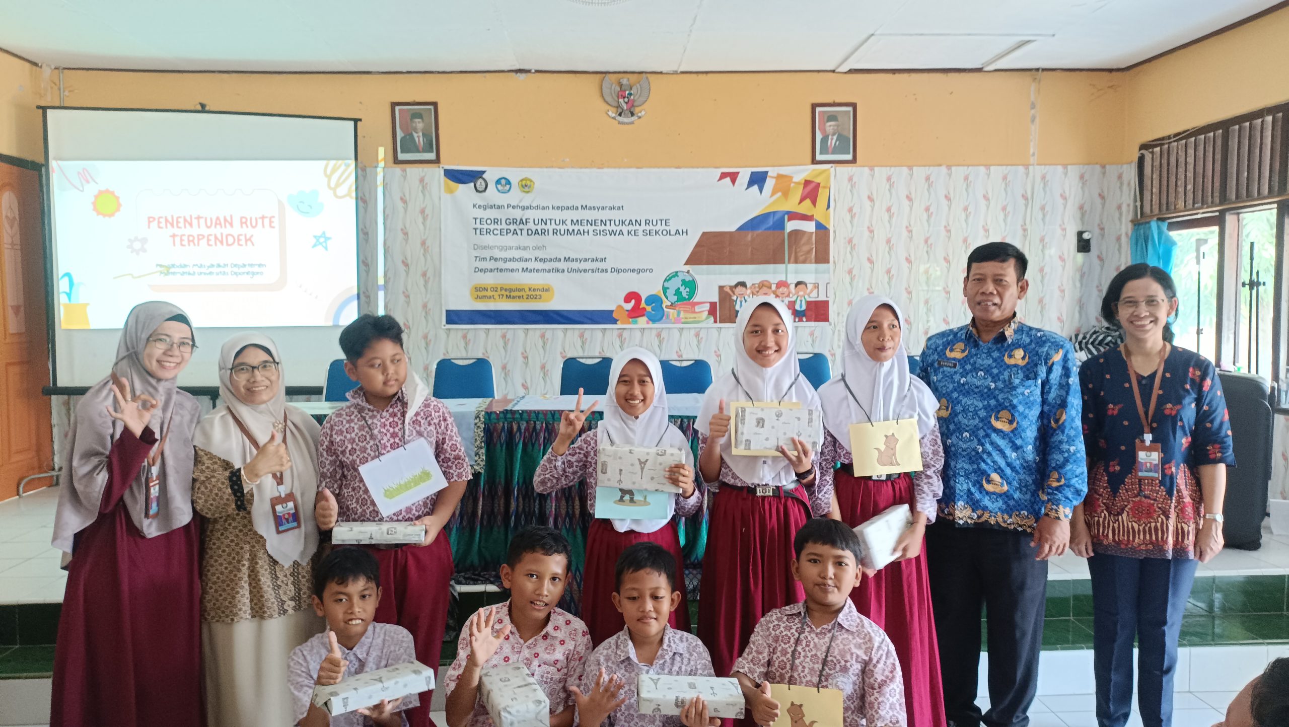 The Community Service Team from the Mathematics Department has held Community Service activities at SDN O2 Pegulon, Kendal by presenting material “Graph Theory to Determine the Fastest Route from Students’ Homes to School”. The Community Service Team chaired by Mrs. Nikken Prima Puspita S.Si, M.Sc and consisting of Mrs. Lucia Ratnasari S.Sc, M.Sc, Mrs. Ratna Herdiana M.Sc, Ph.D and several students from the KBK Algebra and Combinatorics Team was successful attracted the attention and enthusiasm of grade 5 students at SDN 02 Pegulon, Kendal.