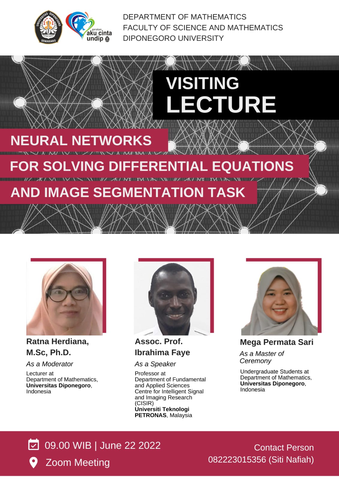 On June 22, 2022, a Visiting Lecture titled “Neural Networks for Solving Differential Equations and Image Segmentation Task” was held with Professor Ibrahima Faye as the speaker. The lecture focused on the application of neural networks in solving differential equations and image segmentation tasks. The event was moderated by Dr. Ratna Herdiana. It took place online via Zoom at 09:00 GMT+7. The lecture provided insights into the cutting-edge techniques of using neural networks for these specific mathematical and image processing challenges.