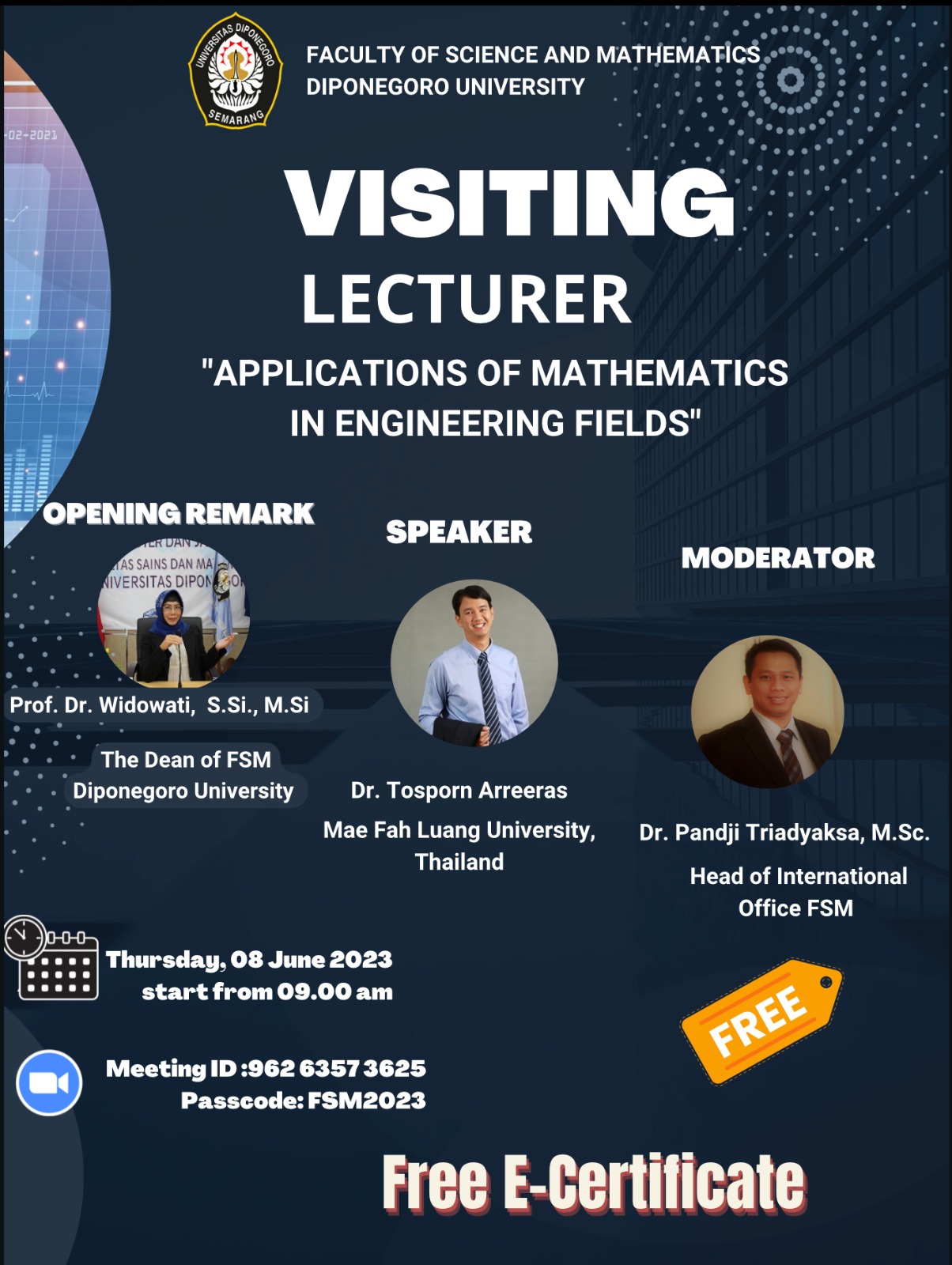 The Faculty of Sciences and Mathematics at Diponegoro University is organizing a Visiting Lecture on the topic “Applications of Mathematics in Engineering Fields.” The event is scheduled for Thursday, June 8, 2023, at 09:00 WIB and will be conducted online via Zoom. Participants can join the meeting using the provided Zoom link, and the Meeting ID and Passcode have been specified for easy access.