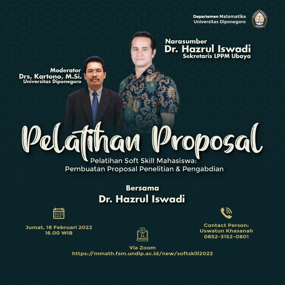Pelatihan Soft Skill Mahasiswa: Pembuatan Proposal Penelitian & Pengabdian bersama Dr. Hazrul Iswadi Penulis: Zani Anjani Rafsanjani HSM, S.Si., M.Sc. (Tim Pengelola Web Departemen Matematika UNDIP) Semarang, 18 Februari 2022 – Mahasiswa memiliki peranan penting dalam pendidikan yakni