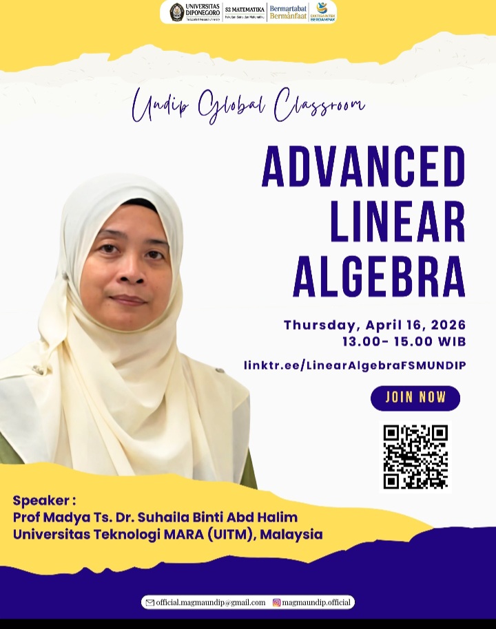 Universitas Diponegoro kembali menunjukkan komitmennya dalam menghadirkan pembelajaran berstandar internasional melalui program Global Classroom dengan tema Advanced Linear Algebra. Kegiatan ini akan dilaksanakan pada Kamis, 16 April 2026 pukul 13.00 WIB hingga selesai secara daring melalui platform Zoom Meeting.