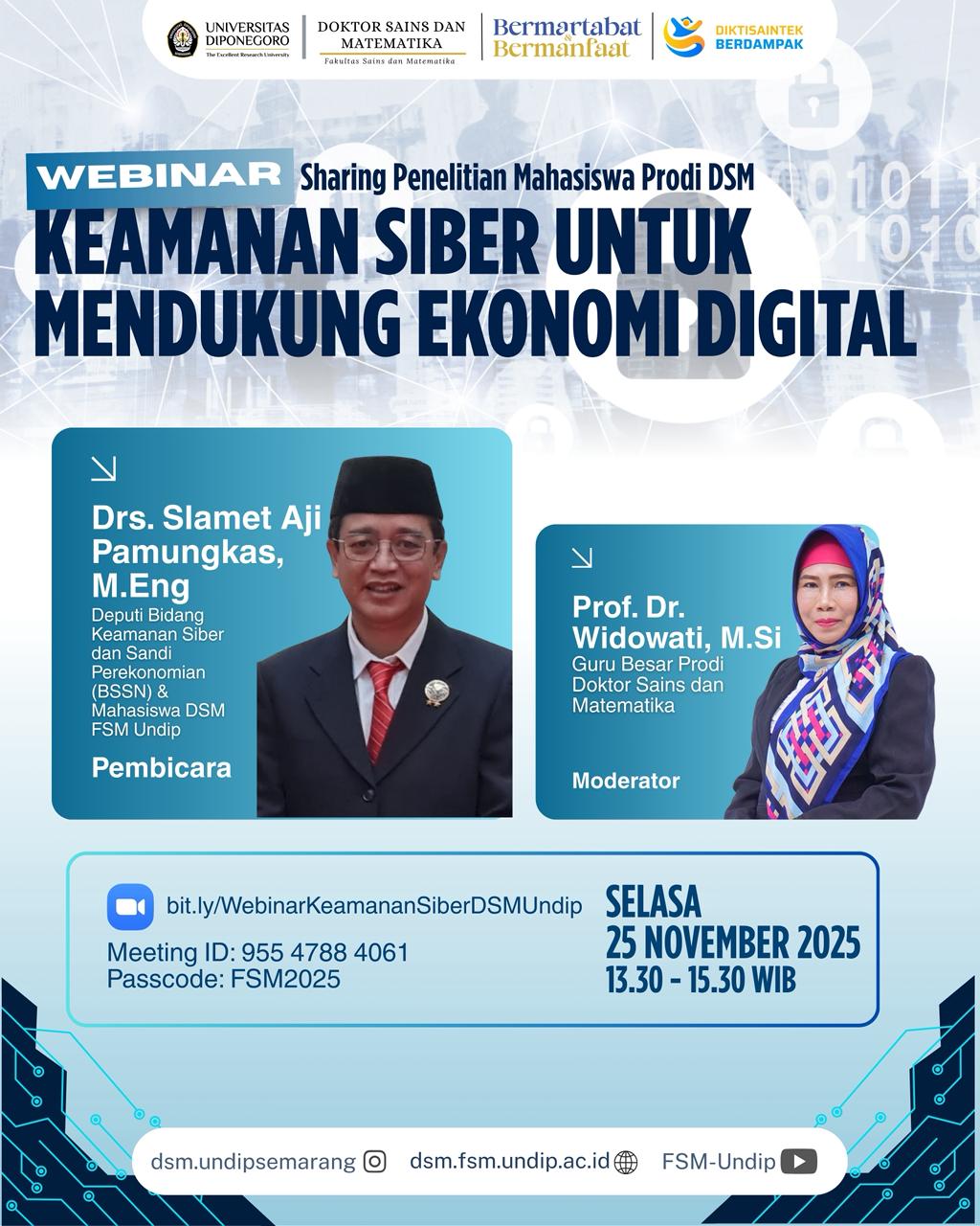 Universitas Diponegoro melalui Program Studi Doktor Sains dan Matematika (DSM) kembali menyelenggarakan webinar ilmiah bertajuk “Keamanan Siber untuk Mendukung Ekonomi Digital”. Kegiatan ini akan dilaksanakan pada Selasa, 25 November 2025 pukul 13.30–15.30 WIB secara daring.